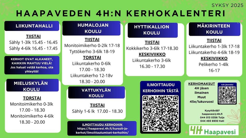 4H-kerhoissa eri puolilla Haapavettä lapset oppivat koulutettujen nuorten kerhonohjaajien tuella monipuolisesti kestävään elämäntapaan liittyviä arjen taitoja. Nuorille tarjoamme työelämä- ja yrittäjyystaitoja, vaikuttamismahdollisuuksia ja paljon muuta. 4H:n työpalvelussa vuosittain kymmenet haapavetiset nuoret saavat tärkeitä ensimmäisiä työkokemuksia. 4H-yritys on upea mahdollisuus kokeilla yrittäjyyttä turvallisesti ja ohjatusti. 4H:ssa opitaan itse tekemällä ja osallistumalla aidoissa tilanteissa ja ympäristöissä. Tervetuloa mukaan!